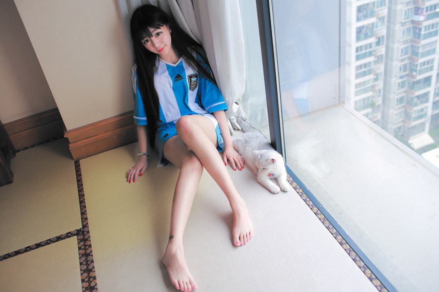 午后的慵懒美少女,透明玻璃墙下的迷人